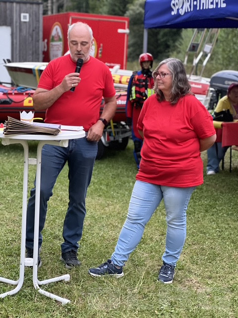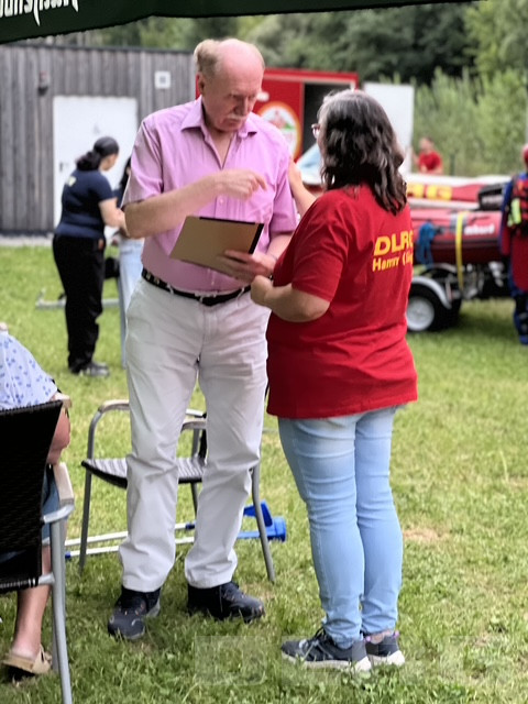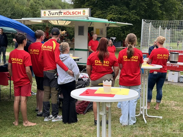 Schwimmen, Ausbilden, Leben retten – Die Powerpoint-Präsentation auf der Theke des Ausschankwagens zeugte von der Arbeit und dem Zusammenhalt in der Ortsgruppe Hamm (Sieg) der Deutschen Lebens-Rettungs-Gesellschaft (DLRG). Zum 65-jährigen Bestehen hießen die Vorsitzende Ulrike Becher und ihr Stellvertreter Peter Hoffmann, die anwesenden Mitglieder und geladenen Gäste willkommen. Das oberste Ziel der DLRG sei immer die Schwimmrettung, zu der eine stetig bessere Ausstattung und Weiterbildung beitrage, sagte Peter Hoffmann. Etwa 25 aktive Mitglieder sind gewappnet, um mögliche Gefahren auf dem Wasser abzuwehren. Dies sei vor allem, so Hoffmann, der guten Ausbildung und der Durchführung der wöchentlich stattfindenden Schwimmkurse für Nichtschwimmer bis zum Rettungsschwimmer zu verdanken.